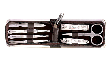 包裝規格:102mm*61mm*24mm 單套重量:108.8g 材質:PU+430不銹鋼 配件:RMT625E指甲鉗、美容剪、斜口指甲鉗、指甲銼、耳挖、死皮刀、眉夾